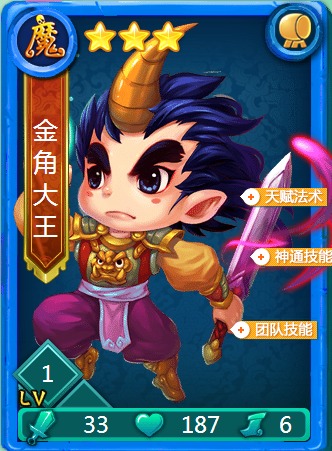 金角大王在迷你西游中主要作为高防御和生存能力的肉盾护法,核心技能元形能通过吸收邻方生命值提升自身攻击力和生命上限,同时承担邻方受到的攻击,这使得它在阵容中起到重要的保护作用。通过合理运用其闪避神通,金角大王能有效缓解团队承伤压力,适合在前排吸引火力并保护后排输出单位。